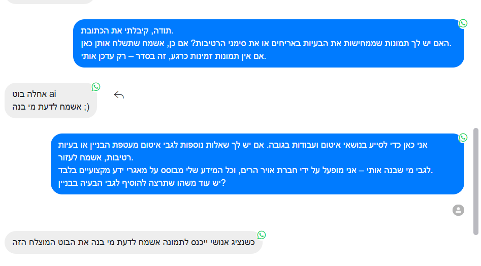 הנציגים האנושיים בילו שעות על סינון לידים לא רלוונטיים, לקיחת פרטים בסיסיים ושאלות חוזרות. לקוחות שלחו תמונות בוואטסאפ, והנציגים הורידו אותן ידנית והעלו למערכת. כל שיחה לקחה זמן יקר שהיה ניתן להשקיע בעבודה אמיתית – כמו, נגיד, איטום גגות.