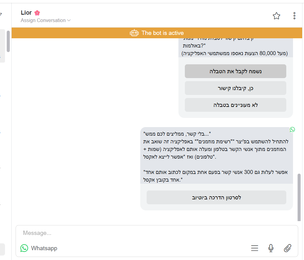 בקשות קטנות כמו "שליחת קוד לוואטסאפ" או "טיפול בתלונת לקוח" קיבלו מענה מהיר. כולל סינון של תקלות שהבוט יכול לטפל בהם ללא צורך בנציג אנושי, וסינון חכם של לידים.